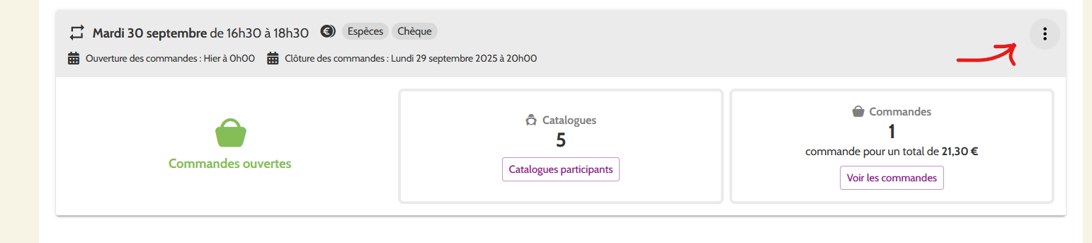 💡 Paiements : En fonction des paramètres du marché, les paiements peuvent se faire à la commande ( paiement en ligne ) ou sur place, le jour de la distribution. ➡️ Cf. doc Gérer les moyens de paiement.