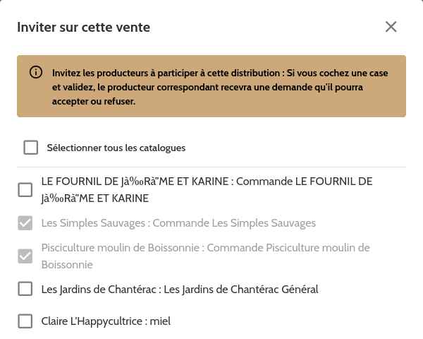 - Cliquez sur ce bouton et cochez les producteurs que vous souhaitez inviter. Un bouton permet de tous les cocher en un clic au besoin.