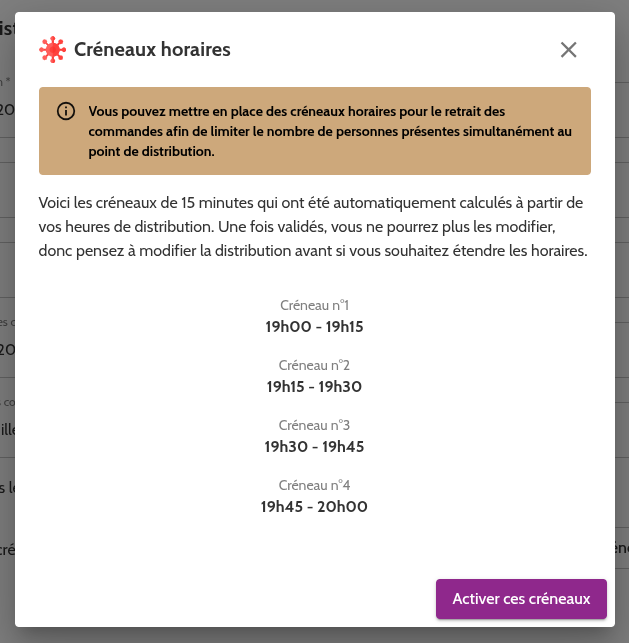 ⏰ Le système des créneaux horaires a été créé pendant la crise du COVID afin de gérer la forte affluence dans les marchés, tout en répartissant au mieux les clients sur la plage horaire de la distribution. Cette fonctionnalité a finalement été conservée car appréciée par certains marchés Cagette.