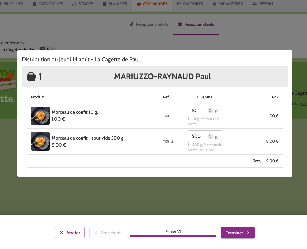 Pour modifier une commande, il vous faudra accéder au récapitulatif par client (cf doc Faire un récapitulatif par clients).