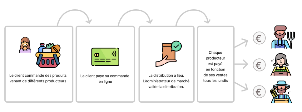 Le paiement en ligne est idéal lorsque plusieurs producteurs collaborent sur un même marché, les clients payent leur commande en une fois par carte bancaire et chaque producteur reçoit le fruit de ses ventes automatiquement.