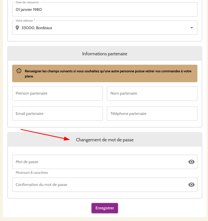 En bas de la page, il y a un bloc "Changement de mot de passe" pour changer votre mot de passe.